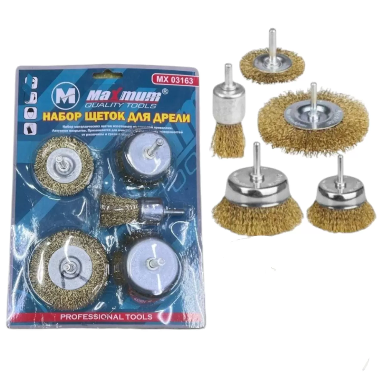 В набор входят: дисковая щетка 50/25 мм, щетка «чашка» 50/25 мм, торцевая щетка 25 мм.
